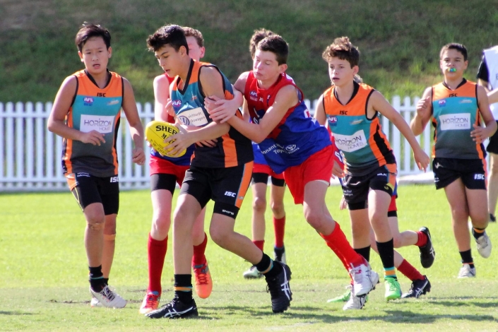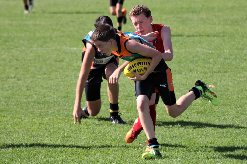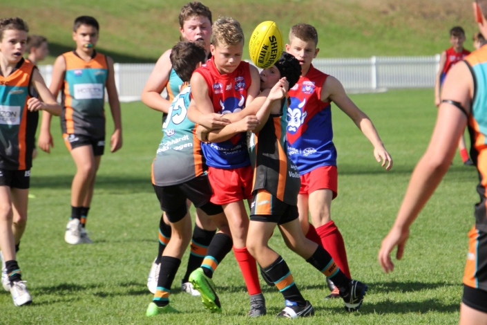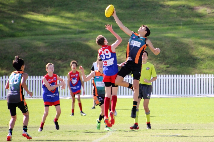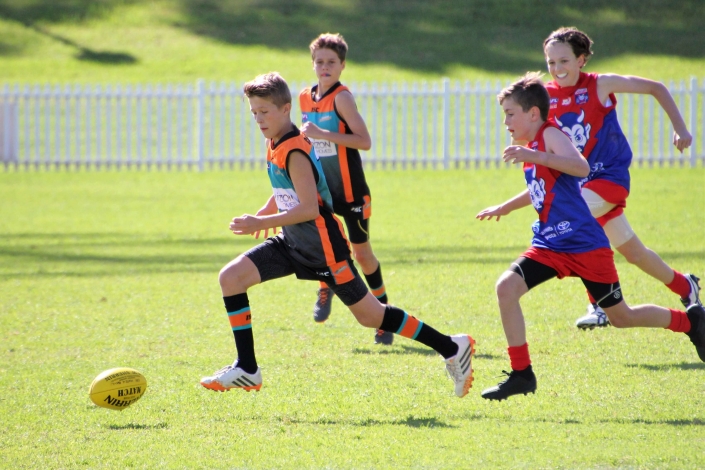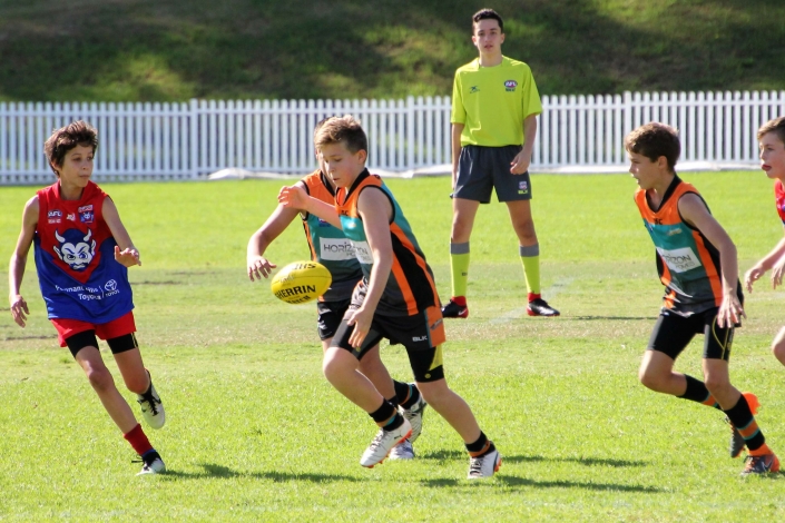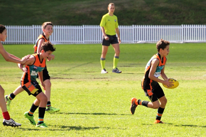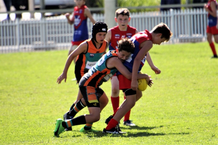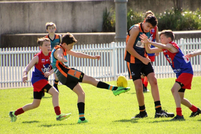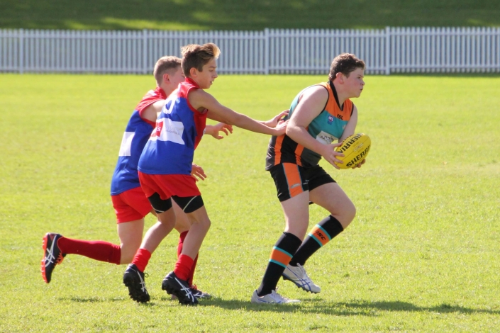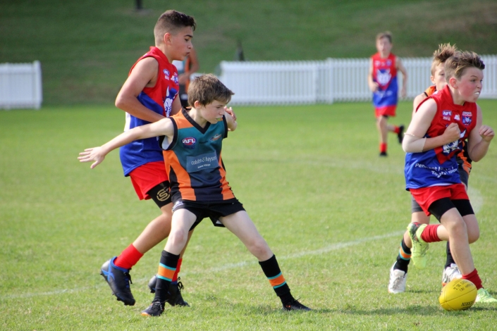 “Intimidating”. That was probably the best way to describe the prospect of playing against a team that so far in season 2018 had recorded two emphatic victories. The Demons looked tall, strong, fit and skilled and no doubt arrived at Drummoyne Oval full of confidence. Despite this, the mood in the Cannons dressing room was determined and focused. The boys took themselves through their warm up drills without the usual mucking around. From the gaze of 17 steely eyed determined faces it was clear the Cannons meant business. With the benefit of a slight breeze and the significant benefit of self belief the Cannons showed their best game. They were hard and uncompromising at the ball. When the quarter time siren blew the Cannons had registered three straight goals and completely shut down the Demon’s dangerous midfield.